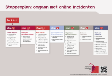 Het ‘Stappenplan: omgaan met online incidenten’ is een overzichtelijk handelingskader voor scholen. Het plan is te gebruiken bij acute online incidenten of als richtlijn voor preventief beleid. Bekijk het ‘Stappenplan: omgaan met online incidenten’ op de website van School en Veiligheid.